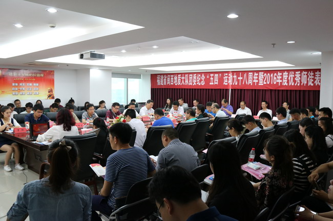 5月4日上午,福建省闽西地质大队团委召开以“不忘初心跟党走”为主题的纪念五•四运动九十八周年暨2016年度导师带徒表彰大会,队领导、队导师带徒活动领导小组成员、受表彰的优秀师徒及团员青年63人参加会议。
