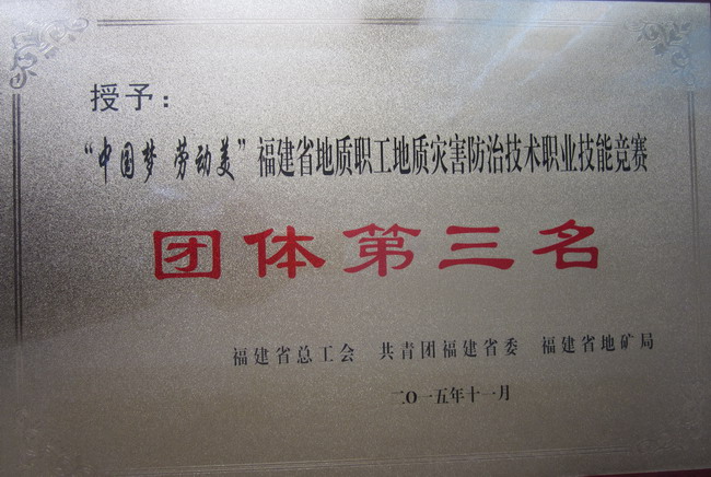 2015年11月12日至13日,由省总工会、共青团省委、省地矿局联合举办“中国梦·劳动美”福建省地质职工地质灾害防治技术职业技能竞赛在福州举行,我队代表队荣获团体第三名的好成绩。