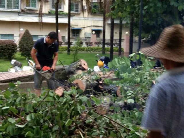 2018年7月11日,受8号台风“玛利亚”影响,下午17:10三明队部值班室附近一棵30年树龄的紫荆花树突然倒伏,将福建省闽西地质大队50号大院唯一的小区道路封堵,严重影响小区内交通。物业所考虑到会对车辆及周边行人造成较大安全隐患,立即组织人员冒着倾盆大雨投入到对倒伏树木的清理,17:30先清理出一条临时行车道后,再由市园林处派出专业人员携带油锯等专业工具,将倒伏树木分段锯开运走。截止到18:50倒伏树木清理完毕,小区道路恢复畅通,消除了安全隐患。