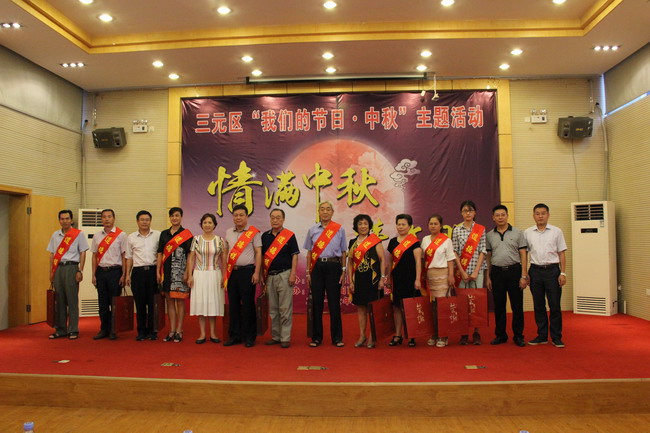 一个小时的精彩演出后,2016年三元区“我们的节日•中秋”主题活动在“情满中秋 点赞文明”中推向高潮:市、区、队有关领导上台为道德模范及身边好人送上月饼及节日问候。三明市委文明办副主任梁闽菊、三元区委文明办主任林朝源、闽西地质大队党委书记张琰、大队长林全胜登台与道德模范、身边好人握手致意并合影留念,让他们在中秋佳节得到礼遇与关爱。