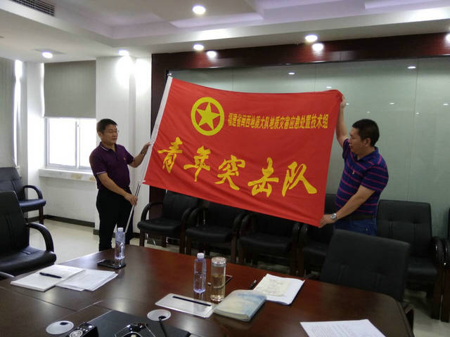 2018年6月28日下午,工勘院党支部在队部八楼会议室开展纪念“七一”系列活动。林全胜队长应邀参加此次活动,并借此活动之机代表大队授予工勘院 “福建省闽西地质大队地质灾害应急处置青年突击队”锦旗,希望工勘院继续保持和发扬地质灾害应急处置突击队精神,积极培养独挡一面的应急人才。