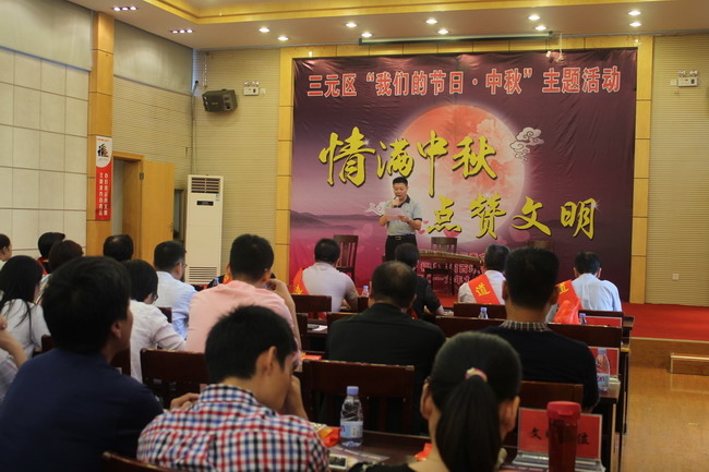 中秋节主题活动在《为三明点赞》的美好旋律中拉开帷幕。三元区委文明办主任林朝源向全体来宾致以节日的问候。他强调,中国传统节日凝聚着中华民族精神和民族情感及整个中华民族文化血脉乃至思想精华,是维系国家统一、民族团结和社会和谐的重要精神纽带,是建设社会主义先进文化的宝贵资源。举办“我们的节日”主题活动,让我们的传统文化、传统节日和传统习俗得以弘扬与传承。中秋节以团圆为主题,凝聚着中华传统文化的和谐精神。中秋月圆,象征着家庭和美,社会和顺,国家和平。通过本次活动表达对团圆佳节的期盼,对三明文明和谐的点赞,对身边好人的点赞,对干部职工和居民群众的节日问候,祝愿大家中秋快乐,幸福美满。