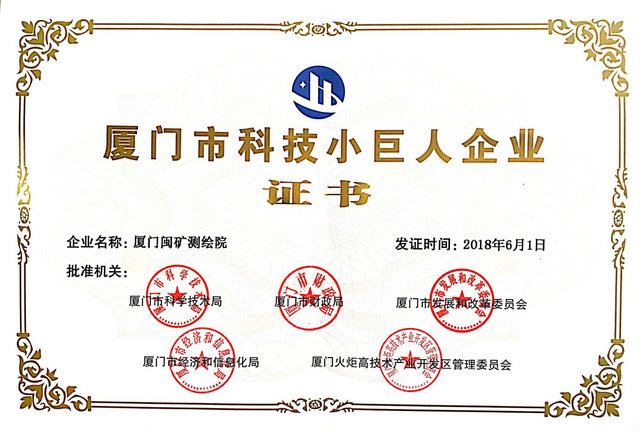 近日,据厦门市人民政府办公厅《关于培育科技小巨人企业行动计划(2016-2020年)与科技小巨人领军企业遴选办法的通知》(厦府办〔2016〕90号)有关规定,由企业申报,经合规性审查、专家评审、市科技小巨人企业培育工作联席会议办公室成员单位联合审核并公示,厦门闽矿测绘院喜获“厦门市科技小巨人企业”称号。