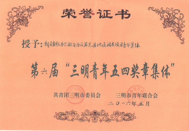 近日,队新疆维吾尔自治区若羌县地质调查项目青年集体荣获第六届“三明青年五四奖章”荣誉。